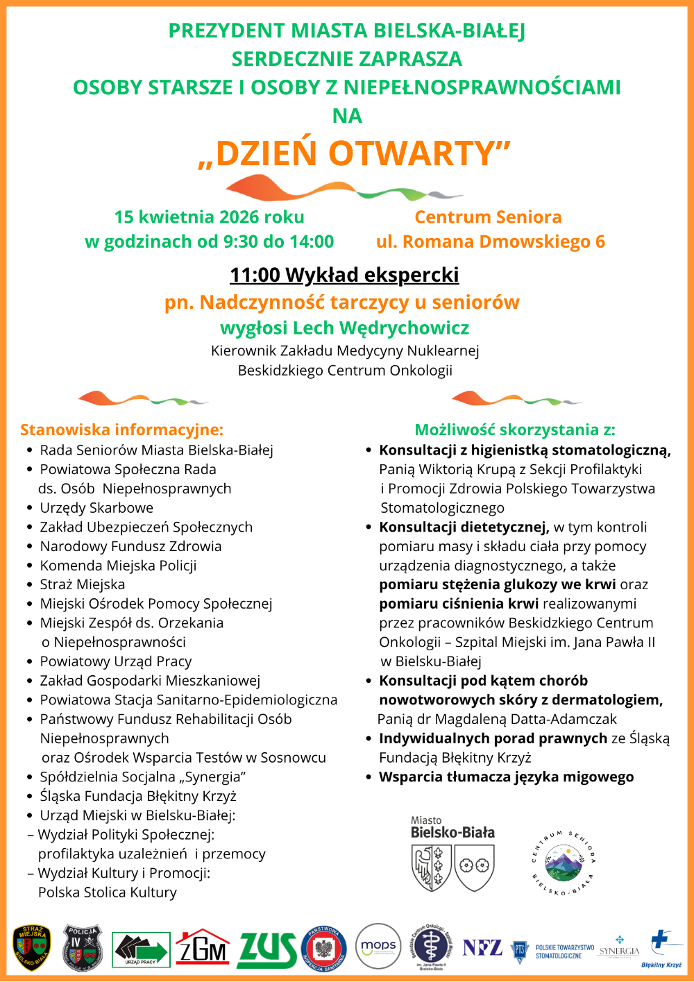 15 kwietnia 2026 roku w godzinach 9:30-14:00 w Centrum Seniora przy ul. Romana Dmowskiego 6 w Bielsku-Białej można udać się na dzień otwarty dla osób starszych i osób z niepełnosprawnościami organizowany przez Prezydenta Miasta Bielska-Białej.