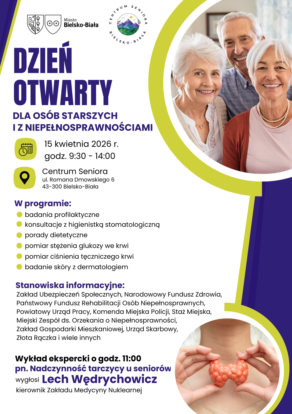 W programie przewidziano wykład ekspercki, który rozpocznie się o godzinie 11:00. Tematem spotkania będzie „Nadczynność tarczycy u seniorów”, a prelekcję wygłosi Lech Wędrychowicz – kierownik Zakładu Medycyny Nuklearnej Beskidzkiego Centrum Onkologii.